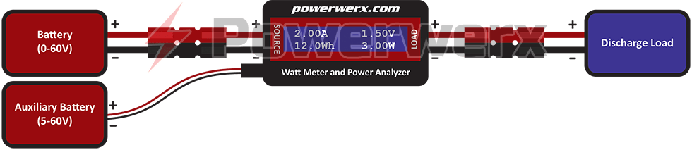 By connecting the watt meter directly to a battery or power source, the meter requires a minimum of 5V to power itself. However, if you are using the optional auxiliary power connector, the meter can be powered through the auxiliary source, and measure the complete range of 0 to 60V. Another benefit of the optional auxiliary power connector is that it powers the meter through the auxiliary source. The regular source to load measurements become more precise, as the measurements do not include the small amount of power required to operate the meter. Only 2 of the 3 wires on the auxiliary power connector are used. Refer to the watt meter black housing for (+) and (-) indicators showing how to power the watt meter using the auxiliary input.
