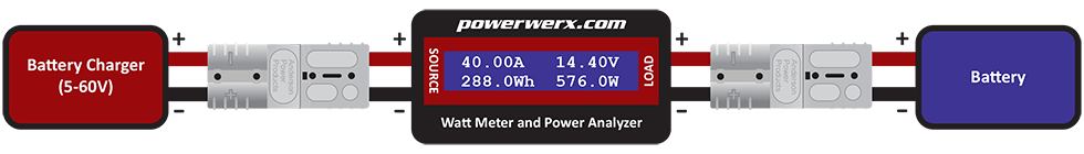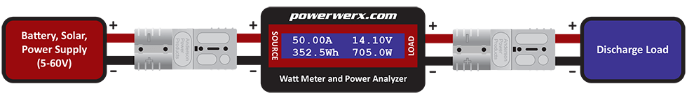 The red source wire goes to the positive (+) source or battery terminal. The black source wire (-) goes to the negative terminal. Use caution when making connections to ensure all connections are tight use adequate wire size to handle higher amps/current. This watt meter is available with either Powerpole connectors pre-installed or with bare wire ends for installation of your own type of connectors.