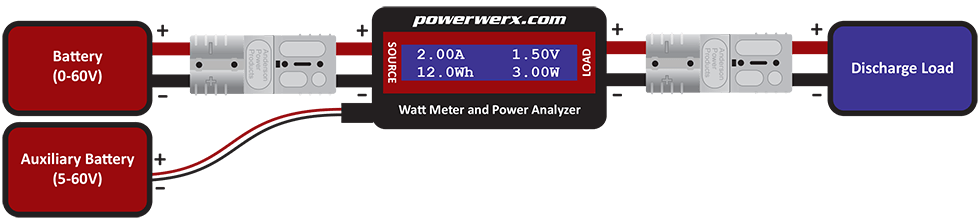 By connecting the watt meter directly to a battery or power source, the meter requires a minimum of 5V to power itself. However, if you are using the optional auxiliary power connector, the meter can be powered through the auxiliary source, and measure the complete range of 0 to 60V. Another benefit of the optional auxiliary power connector is that it powers the meter through the auxiliary source. The regular source to load measurements become more precise, as the measurements do not include the small amount of power required to operate the meter. Only 2 of the 3 wires on the auxiliary power connector are used. Refer to the watt meter black housing for (+) and (-) indicators showing how to power the watt meter using the auxiliary input.